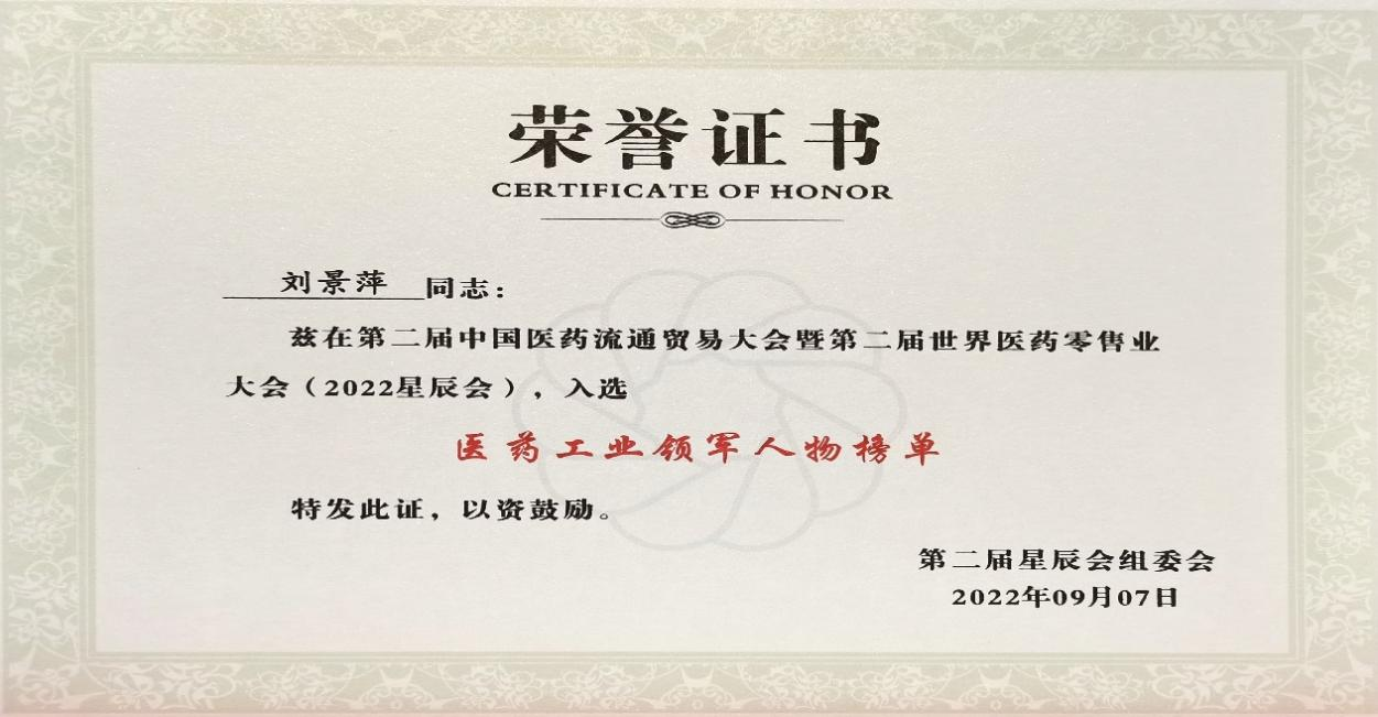 在本次开幕式上,发布了“医药工业领军人物”、“医药零售领军人物”榜单,G22恒峰药业集团刘景萍董事长凭借在儿药领域多年的努力探索和对行业的杰出贡献,荣获“医药工业领军人物”称号。